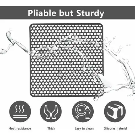The silicone material is flexible and bendable. Our sink mat would conform to a slight curve on the side of the sink, suitable for sinks no larger than 13.5 x 13.5 inches. The silicone sink mat will cushion the sudden force if dishes or bowls fall into the sink. Good protection for your fragile glassware and your stainless steel or ceramic sink. Raised, non-slip feet elevate the sink mat to allow small food particles and water to pass through. Also works as a dish drying mat under the sink. Our kitchen sink protector can withstand up to 500F so you can safely place pans and dishes in the sink or porcelain counter directly from the oven or stove. Another advantage of the silicone material is that it is rustproof, it will be more durable if cleaned periodically. 【Warm Tips】 Package: 1 x Silicone Sink Protector. Irregular patterns can hold food residue effectively but will be a bit difficult to clean. It is recommended to clean the sink protector periodically to prevent too much waste from piling up. Before buying, please make sure the size of the sink for a perfect choice.