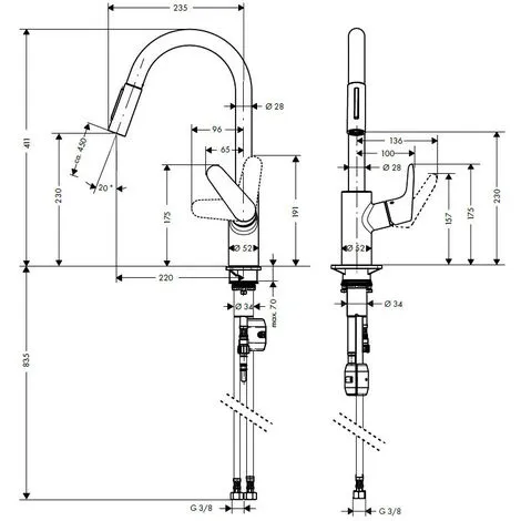 Features of the Hansgrohe Focus M41 Single lever kitchen mixer 240 with pull-out spray, 2 spray modes, Chrome (31815000) :