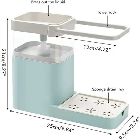 Product Description Material: PP Color: Green Size: 25*21*9.5cm Quantity: 1 piece Package Included: 1 * Washing Up Liquid Dispenser 1. [Easy Operation] Save your time and energy! Simply press down with a sponge and the pump will release more soap when needed. The attached set can store sponges, brushes, cloths and scouring pads in one convenient place while keeping the kitchen countertop clean. No more messy spills, drips or marks! 2. [Keep Your Sink Clean] Tired of messy kitchen counters? Hate when your sponge ends up filling the sink with dirty dishes? Our set ensures order. 3. [Durable] Our soap dispenser set is also equipped with dishwashing sponge, tea towel and liquid soap brush. This kitchen soap dispenser box is designed by our factory, using solid materials, so you can rely on it for a long time. 4. [Excellent Value for Money] Buy a large capacity kitchen soap dispenser set, complete with all the finishing accessories that can hold it all. You won’t find a better deal than this practical, clean and tidy kitchen.