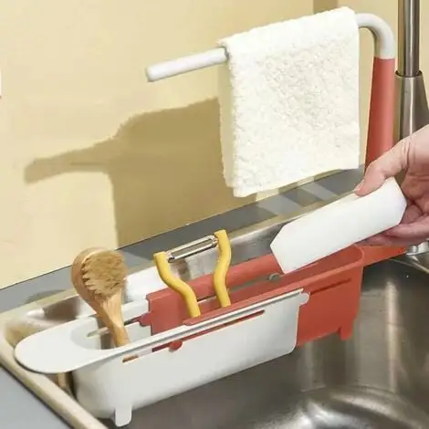 Ideal tool for the kitchen:The telescopic rack does not take up much space, but it has a towel rack on it besides the drain rack basket for sponges, cleaning brushes, etc., which can be used to dry fabrics such as towels, making it less prone to production peculiar smell.