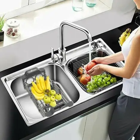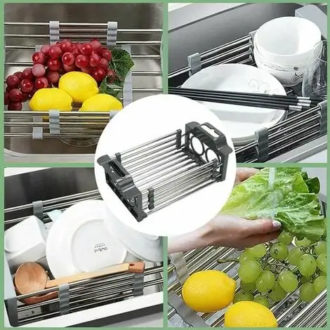 Telescopic adjustable: product size – length 11.2 width 7.6 height 3.7 in. Adjustable from 11.2 to 16.5, perfect fit for your sink. FUNCTIONAL DESIGN: multiple functions for drying dishes, fruits and vegetables. Encourage staying on top of dishwashing. Handy for drying dishes and perfect for those few dishes that need to be washed or don’t want to use the dishwasher or those that are too delicate. PREMIUM QUALITY: The bracket is made of 304 stainless steel and ABS plastic, corrosion, acid and alkali damage. large load-bearing capacity, not easy to fall off, deformation Widely used: the dish drying rack is large enough, drying and organizing dishes, cups, cups. Rinse and drain fruits, vegetables. Very suitable for saving counter space. SPACE SAVER: Stainless steel dish rack with adjustable bars fits over the sink or on the counter and takes up only a fraction of the space. Non-slip extendable arms prevent the rack from falling into the sink and four rubber coated feet to protect your sink and counter from scratches perfectly. About our dish drying rack Multiple functions for drying plates and cups, drying or cleaning vegetables and fruits, storing your knives and forks. This over the sink drainer can be used not only above the sink, but also on the counter. Premium heavy duty stainless steel attached to the dish drainer. Sturdy SUS304 stainless steel construction can hold heavier dishes, heavy duty even with fully extended. Dish drainer with adjustable handle fits over the sink or on the counter and takes up only a fraction of the space. Sink Drying Rack Size: Dish Rack: 11.2L x 7.6W x 3.7H, adjustable from 11.2 to 16.5, perfect fit for your sink. The basket fits most sinks and the best sink size is around 13-16 inches. Please check the dish rack size before purchasing. Package Included: 1 x Dish Drainer/Retractable Drying Basket